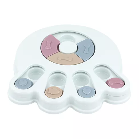 My Border Collie, Grace, just loves this "toy." Dogs like Grace need constant mental, physical, and emotional stimulation and this thing helps for a few minutes in the evening. She has learned to check index every one, looking for a treat. When she finds one, she not only gets a treat, but she gets our praise. She has learned to use both her nose and her paw to manipulate the rounds. It is well built and heavy enough that it stays in place when Grace is playing with it. Because she still chews everything, after a few games, we take it up off the floor. Wonderful toy and I'm highly recommending.