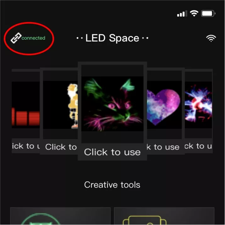 Make sure you connected to the backpack by the green word “Connected” in the left corner. Now you can enjoy all the options of the LED Backpack!