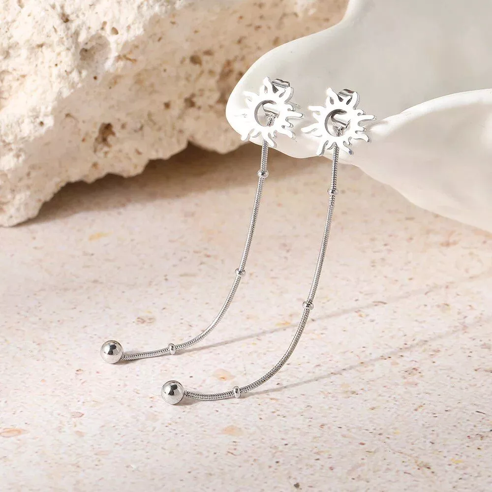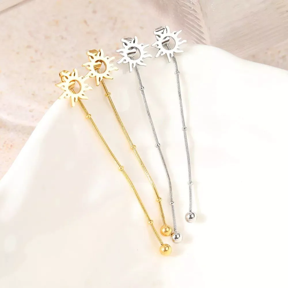 Elevate your style with our exquisite Stainless Steel Earrings, featuring a captivating blend of classic charm and modern flair. The intricate design, combining the allure of sun totems and the chic appeal of long snake beads chain, makes these stud earrings a must-have for any fashion-forward woman.